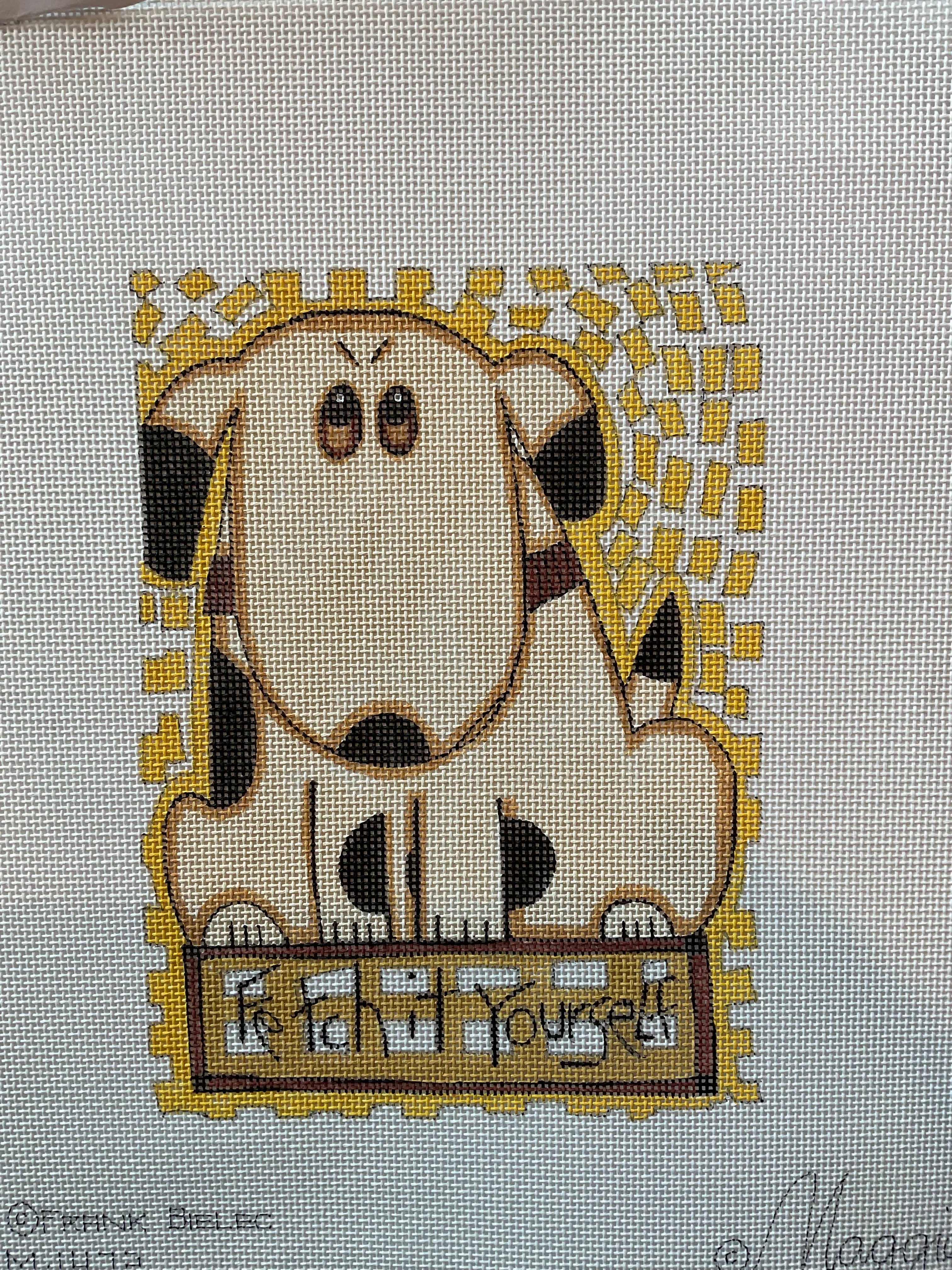 Sassy dog saying what all our dogs have probably thought to themselves at one point or another… fetch it yourself! 18M canvas, could of course be a small pillow or maybe a weighted standup or bookend if you want to get creative!